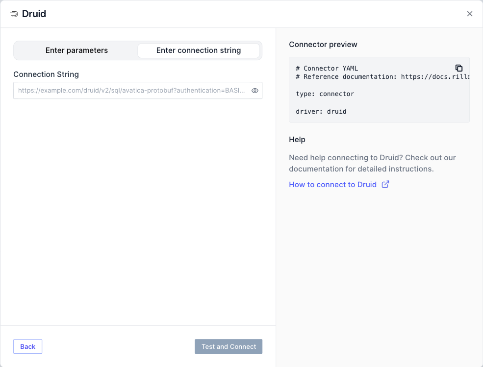 druid.yamlfile in yourconnectorsdirectory and populate the.envfile withconnector.druid.passwordorconnector.druid.dsndepending on which you select in the UI.