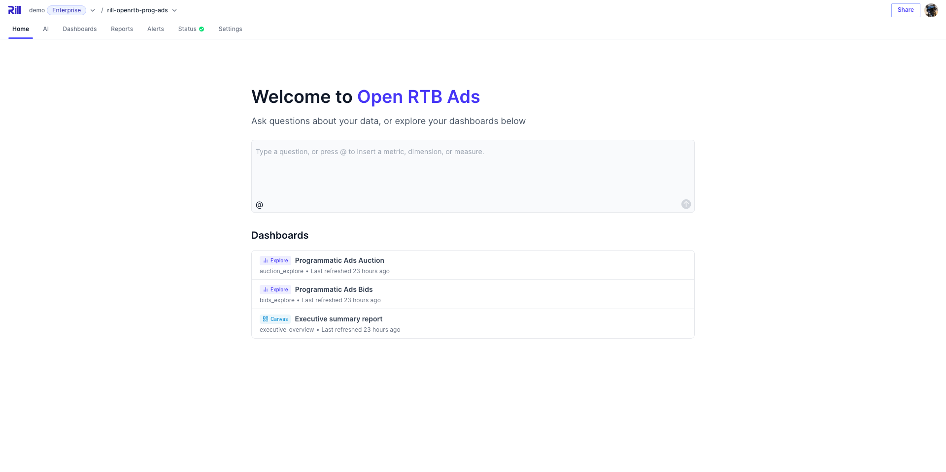Rill Cloud is a fully-managed platform that brings powerful, interactive analytics directly to your fingertips. Explore your data through instant dashboards, ask questions in plain English with AI Chat, and share insights with your team—all without writing SQL or waiting for custom reports. Your data team has already set up the metrics and dashboards you need; you simply explore, analyze, and collaborate.